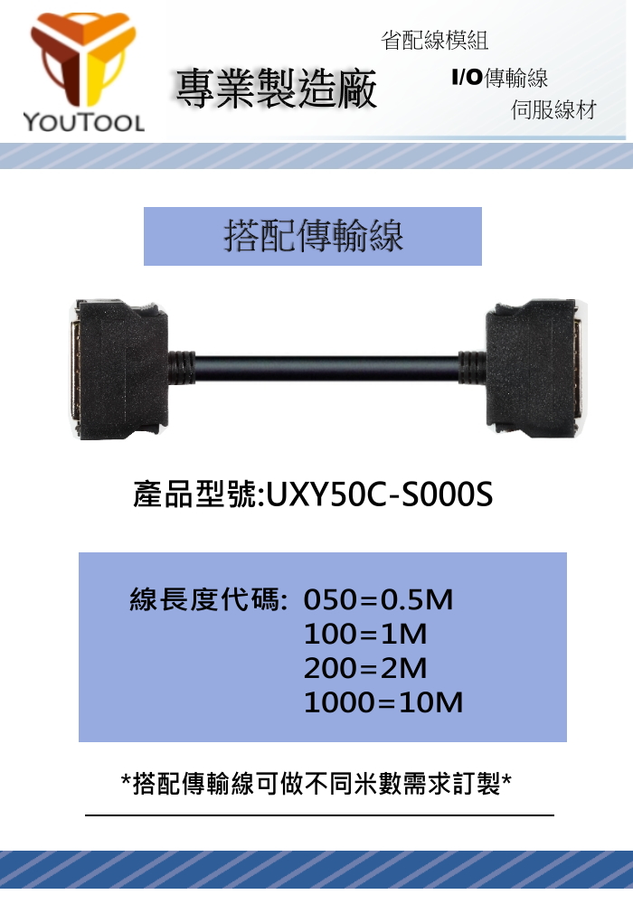 | 伺服對應模組 | AH10PM-5A、AH15PM-5A、ASDA-A2 SERVO、ASDA-A3 SERVO | UXY50C-S100S (1米) ►點擊瀏覽產品規格 |